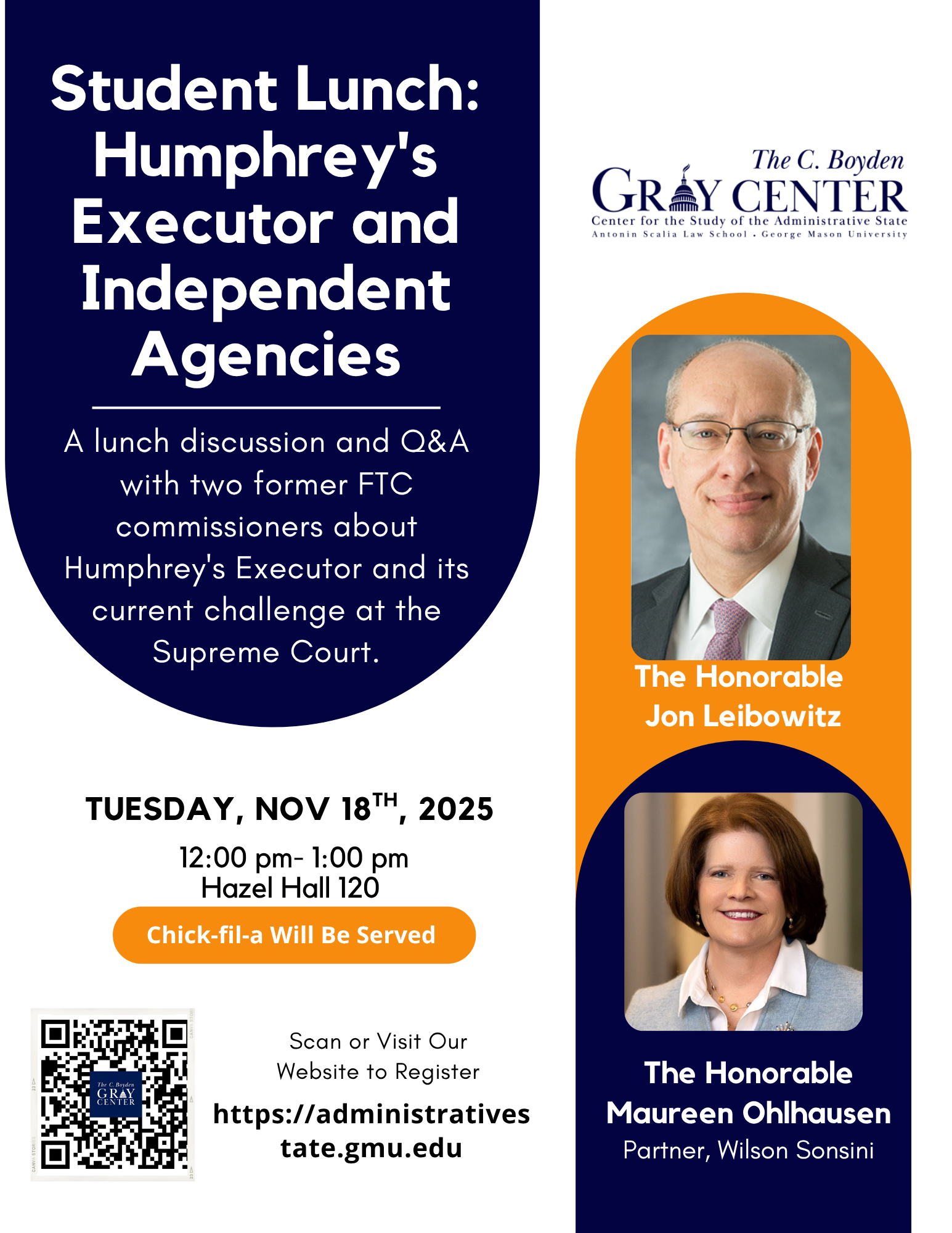 Antonin Scalia Law School 3301 Fairfax Dr, Arlington, VA, United StatesJoin us for a lunch discussion and Q&A with two former FTC commissioners about Humphrey's Executor and its current challenge at the Supreme Court. Register here! Tuesday, November, 18th, 2025 | 12:00 pm- 1:00 pm, Hazel Hall 120 Panelists: The Honorable Jon Leibowitz Jon Leibowitz was Chairman of the Federal Trade Commission from 2009 through 2013 […]